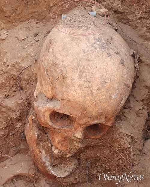 백골은 고개를 푹 떨구고 입을 벌리고 있었다. 견디기 힘든 고통에 심하게 일그러졌을 당시 표정이 그대로 드러났다. 머리 위에는 파랗게 녹슨 탄피가 얹혀있다. 총알은 그의 머리 또는 몸통에 박혔을 것이다. 손목뼈에는 삐삐선이 감겨있다.