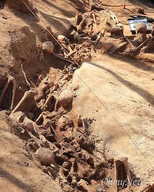 | ▲ 지난 14일 발굴을 시작한 지 일주일 만에 드러난 유해는 모두 25구에 이르렀다. 구덩이 크기는 폭 3m, 길이 14m 정도다. 주민들에 의하면 이 구덩이는 군인들이 적의 침입에 대비해 은폐 또는 엄폐를 위한 용도(방공호)로 만들었다. |
