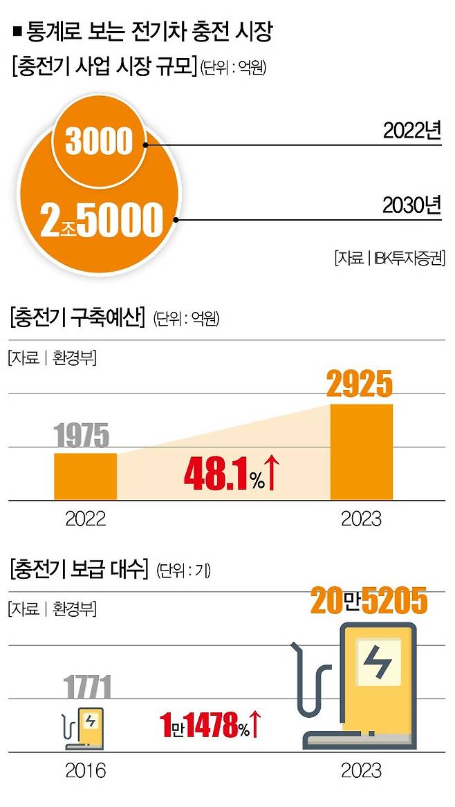 빠른 속도로 성장하고 있지만 정작 품질이 따라가지 못하는 곳이 있다. 국내 전기차 충전 시장이다. 이 시장의 성장세부터 살펴보자. IBK투자증권에 따르면 지난해 국내 전기차 충전기 사업 시장의 규모는 3000억원 수준이었다. 2030년에는 이 시장이 2조5000억원 규모까지 성장할 것으로 전망된다.