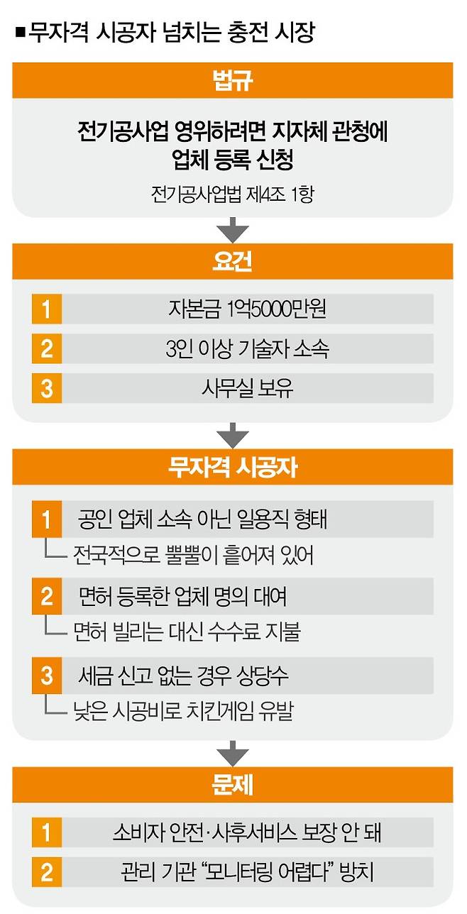반면 면허를 등록한 공인 업체에 속하지 않은 무자격 시공자는 일용직 형태로 전국을 떠돌아다니면서 충전기 설치 공사를 한다. 당연히 불법이다. 전기공사업법 제3조 1항에 따르면 전기공사는 정식으로 등록된 공사업자가 아니면 도급을 받거나 시공을 할 수 없다.