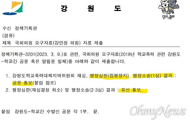이어 권 의원은 "이를 위해 강원도가 학폭 가해자에게 유리하도록 선택적으로 통지했는지 사실 확인과 함께 제1심 집행정지기각 및 청구기각 자료를 (행정심판위에 제대로) 제출하는 등 강원도가 행정심판 피고로서 성실하게 임했는지 사실 확인이 필요하다"고 지적했다.