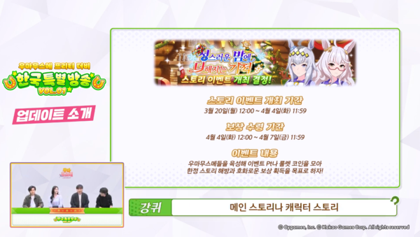 카카오게임즈는 15일 오후 6시 모바일 육성 시뮬레이션 '우마무스메: 프리티 더비(이하 우마무스메)' 한국 특별 방송 vol.1을 진행했다. 고정 패널인 강퀴를 비롯해 특별 게스트로 진수, 나기 등 인플루언서와 함께 한 이번 방송에서는 신규 업데이트 분석 및 인플루언서 VS 카카오게임즈 담당자의 스페셜 매치를 선보였다.