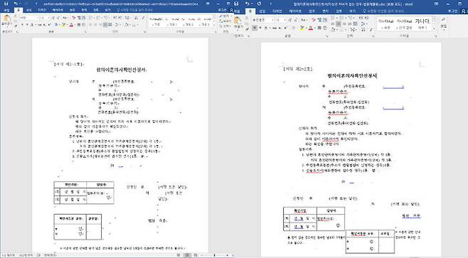 문제의 워드 파일을 열면 상단에 '콘텐츠 사용'이라는 버튼이 뜨는데, 이 버튼을 클릭하면 '협의 이혼 의사 확인 신청서' 양식이 뜹니다.