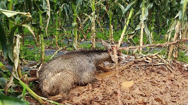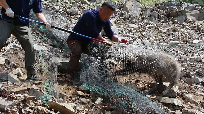 산양을 위협하는 그물은 밭 주변에만 있는 게 아니다. 물고기를 잡으려고 강에 쳐놓은 그물도 산양의 생명을 노리는 위험물이다. 일단 걸리면 스스로 빠져나올 수 없다. 구조 여부가 생사를 가르는데, 얼마나 빨리 발견돼 신고가 들어오느냐에 달렸다. 지난해 5월 24일 양구 소양강에서 그물에 걸린 산양 1마리가 발견됐다. 산양이 강 속으로 들어갔다 걸린 게 아니다. 물 먹으러 강으로 내려왔다가 물 밖으로 드러난 그물에 사고를 당했다. 수위가 낮아지면서 강 속에 있던 그물이 물 밖으로 나온 거다. 그물에 걸린 산양은 3살짜리 암컷이다. 사고를 당한 지 얼마 안 된 듯 날뛰는 힘이 넘쳤다. 구조대원들이 그물에서 꺼내느라 진땀을 흘렸다. 다행히 다친 곳이 없고, 탈진도 아주 심한 상태가 아니어서 건강을 회복했다. 산양증식복원센터에서 보호하고 있는데, 올해 안에 자연으로 돌려보낼 계획이라고 한다.