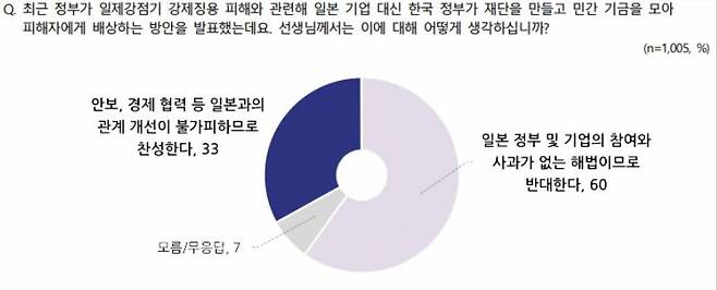 반면 ‘일본 정부 및 기업의 참여와 사과가 없는 해법이므로 반대한다’는 응답은 2배에 달하는 60%로 조사됐다.