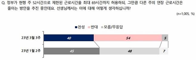 정부의 주 69시간 근로제도 개편과 관련해서는 ‘근로시간과 휴무를 유연하게 조정할 수 있어 찬성한다’는 응답이 40%로 조사됐다. ‘노동자가 과도한 연장근로를 강요받을 수 있어 반대한다’는 응답은 54%다.