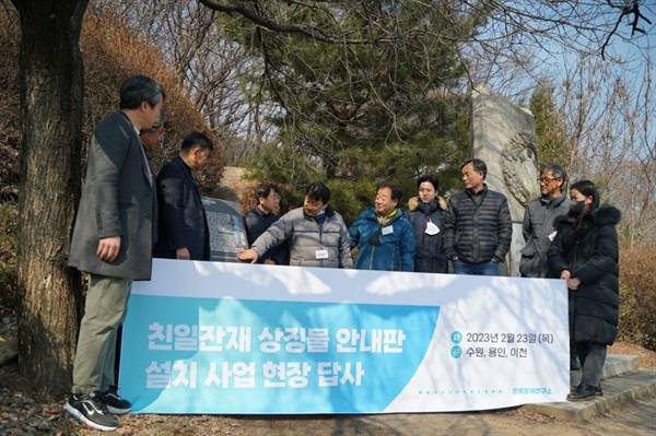 | ▲ 안내판과 현장 점검단 2월 23일 친일 잔재 안내판 설치 현장 점검단, 왼쪽부터 이학성 재단 정책사업팀장, 송창진 경기문화재단 지역문화교육본부장, 조상형 경기도 문화종무과장, 김도형 문화재 전문위원, 방학진 민족문제연구소 기획실장, 강진갑 역사문화콘텐츠연구원장, 최기남 경기도청 주무관, 김해규 평택인문연구소장, 박진우 민족문제연구소 수원지역위원장, 양근혜 경기문화재단 담당관 |