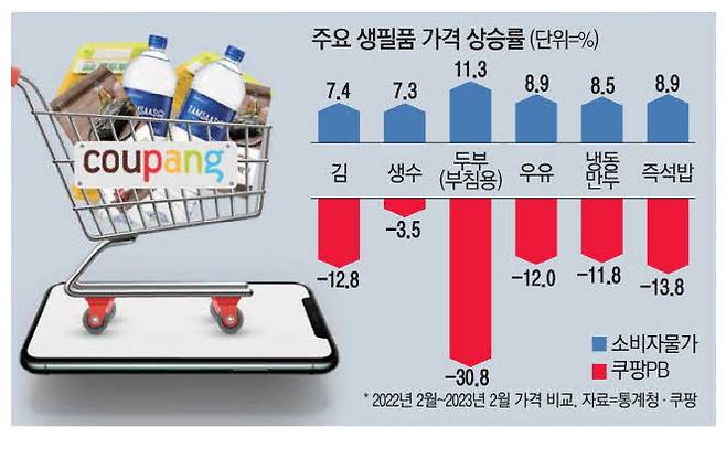 16일 매일경제가 소비자 물가정보서비스가 매달 가격 변동 추이를 조사해 발표하는 생활필수품 39개 품목 중에 쿠팡이 PB 브랜드로 판매하는 18개 품목을 선별해 지난해 2월과 올해 2월 사이의 가격 변화를 비교한 결과 대기업 제조사의 18개 품목 40개 베스트셀러의 판매 가격은 평균 9.5% 오른 반면 쿠팡 PB 상품 가격은 평균 1.1% 하락한 것으로 나타났다.