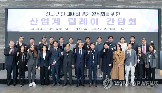 (서울=연합뉴스) 고학수 개인정보보호위원회 위원장(앞줄 왼쪽 일곱 번째)이 16일 경기 성남시 네이버 신사옥에서 열린 '개인정보 보호법 개정 계기 온라인 플랫폼 기업 대표들과의 간담회'에서 참석자들과 기념 촬영하고 있다. 2023.3.16 [개인정보보호위원회 제공. 재판매 및 DB 금지]