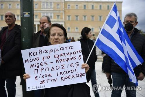 An elderly woman holds a Greek flag and a placard where reads in Greek "Bastards, you are only capable of bribes, thefts and betrayals, on the gallows", during a 24-hours general strike in front of the Parliament in central Athens, on Thursday, March 16, 2023. Strikes by labor unions in Greece following a rail disaster last month have disrupted public transport and extensively disrupted services, with protests in cities across Greece planned later Thursday. (AP Photo/Michael Varaklas)