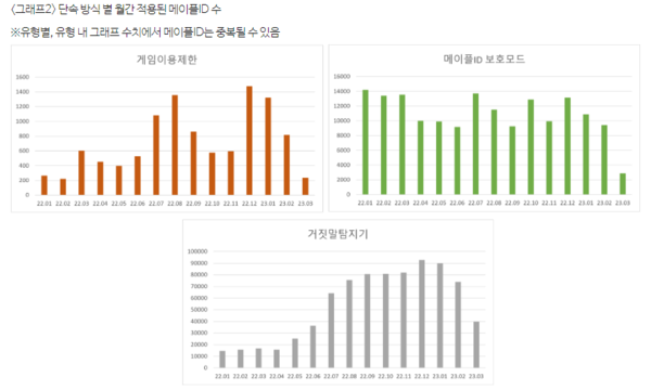 단속 방식 별 월간 적용된 메이플 ID 수 그래프에서도 최근 게임 이용 제한 과 메이플 ID 보호모드 적용 수치가 상승 중이다. 넥슨은 최근 핵, 매크로 관련 관심도가 높아지면서 핵, 매크로를 시도한 유저들이 많아졌고 이에 따라 단속도 상승한 것으로 추측했다.
