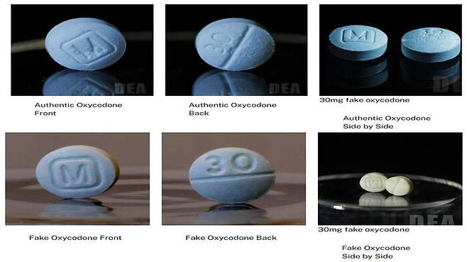 DEA는 이 가짜 알약이 옥시코돈, 하이드로코돈, 알프라졸람 등 합법적인 약과 비슷한 모양을 띠고 있다면서 아주 흡사한 모양의 두 알약 사진을 비교해서 게시하고 있습니다.