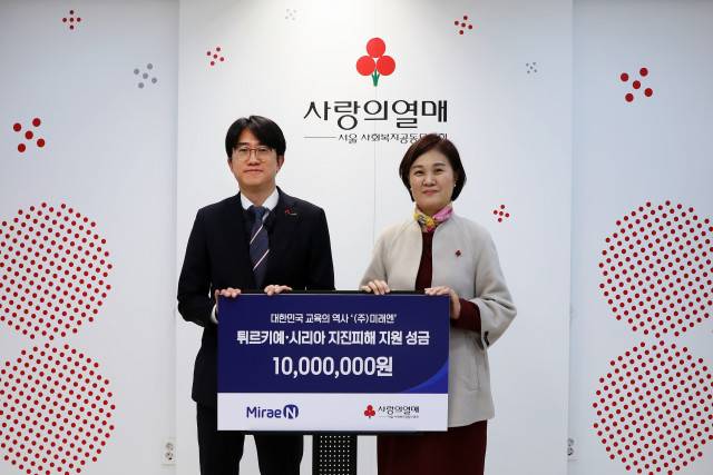교육 출판 전문기업 미래엔이 튀르키예·시리아 지진 피해를 돕기 위해 서울 사랑의열매 사회복지공동모금회에 성금 1000만원을 기부했다.