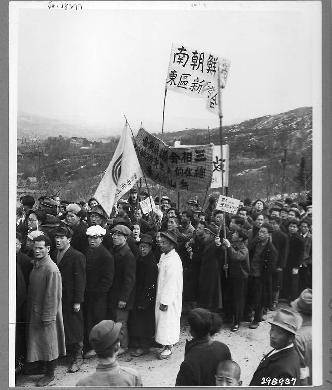 | ▲ 1946. 3. 1. 서울. 신탁통치 지지 궐기 대회로 가마니를 펼쳐 구호를 쓴 프래카드가 이색적이다 |