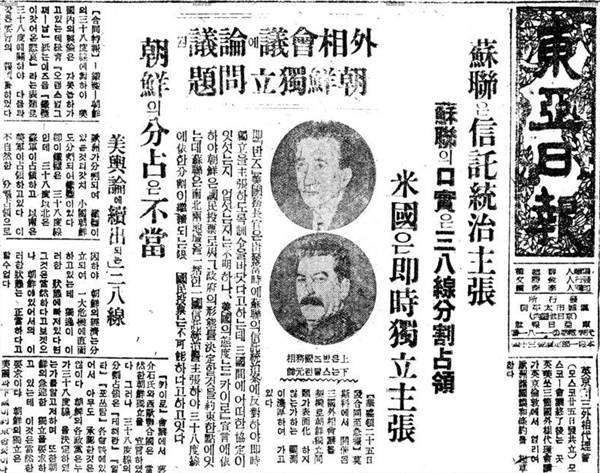 한반도의 5년 신탁통치안이 국내 신문에 보도되면서 남한의 정국은 마치 벌집을 쑤셔놓은 것 같았다. 신탁통치 소식을 처음 전한 <동아일보>는 1945년 12월 27일 "소련은 신탁통치 주장, 미국은 즉시 독립 주장"이란 제목의 1면 머릿기사를 대서특필했다. 외신 보도의 형식이었다.