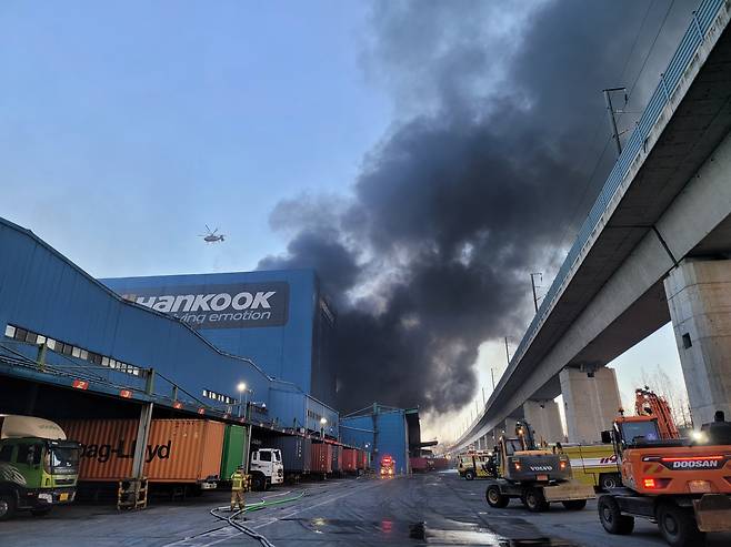 | ▲ [13일 월] 대전 대덕구 한국타이어 공장에서 난 불로 인해 연기가 치솟고 있다. 12일 오후 10시 9분께 발생해 13시간 만에 불길이 잡혔으나 축구장 12개 면적인 8만 7000㎡가 소실됐고 타이어 21만 개가 탄 것으로 알려졌다. 이 불로 작업자 10명과 소방대원 1명 등 11명이 연기를 마시는 등 경상을 입고 치료를 받았다. |