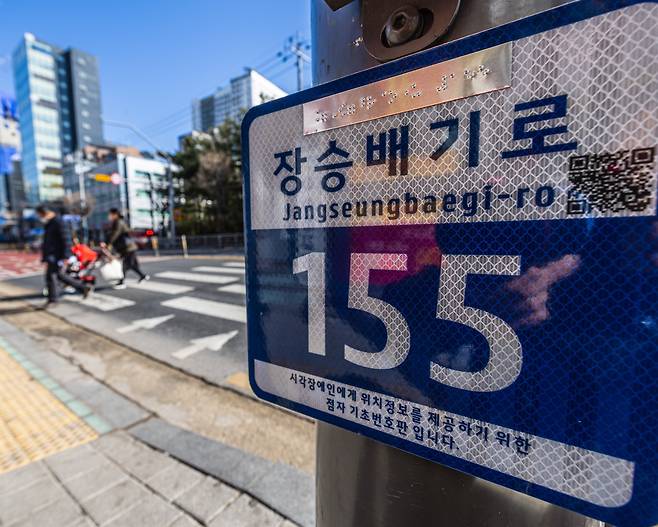 | ▲ [13일 월] 서울 동작구의 한 도로 건널목에 시각장애인의 안전 통행에 도움이 될 점자 기초표지판이 설치돼 있다. 전국 최초로 점자 표기 도로명주소 기초번호판을 도입한 동작구는 주요 건널목과 지하철역 50곳에 시범 설치했다. 점자 기초번호판은 해당 지점의 위치를 안내하는 도로명주소 안내표지판에 점자를 표기한 것이다. |