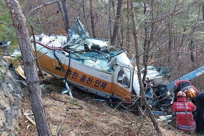 | ▲ [15일 수] 강원 영월군 북면 공기리에서 민간 헬기 1대가 마을회관 인근 산 중턱으로 추락해 소방 당국이 구조활동을 펼치고 있다. 경찰과 소방 당국은 이 사고로 탑승자 2명이 숨졌으나 화재 등 2차 피해는 없다고 밝혔으며 헬기가 송전탑 공사를 위해 전선을 운반하던 중 송전선로에 걸려 사고가 난 것으로 추정하고 있다. |