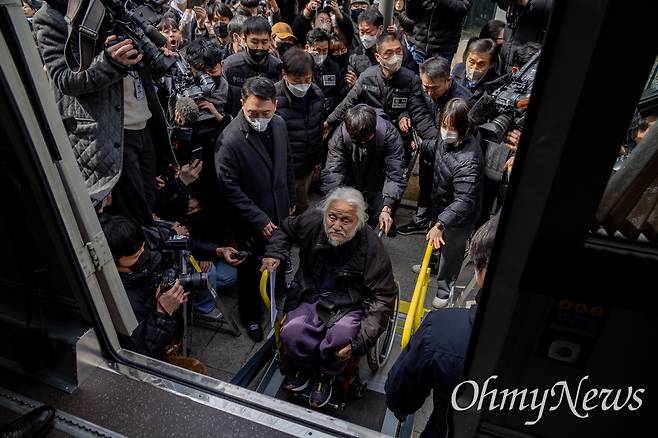 | ▲ [17일 금] 박경석 전국장애인차별철폐연대 상임공동대표가 서울 종로구 서울경찰청 앞에서 기자회견을 마친 뒤 서울 남대문경찰서로 향하는 호송차량에 탑승하고 있다. 지난 15일 남대문경찰서가 박 대표에 대해 기차교통방해·업무방해·집회및시위에관한법률 위반 혐의로 청구한 체포영장이 전날 법원으로부터 발부되었다. |