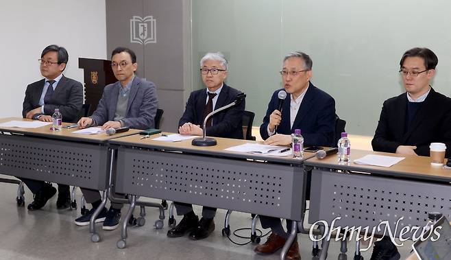 | ▲ [14일 화] 서울대학교 민주화교수협의회 소속 이준호 생명과학부 교수(왼쪽부터)와 김백영 사회학과 교수, 김명환 영문학과 교수, 남기정 일본연구소 교수, 이동원 국사학과 교수가 교수들이 서울 관악구 서울대 관정관 별관동에서 기자회견을 열고 윤석열 정부의 일제 강제동원 판결 관련 해법을 비판하며 철회를 촉구하고 있다. |