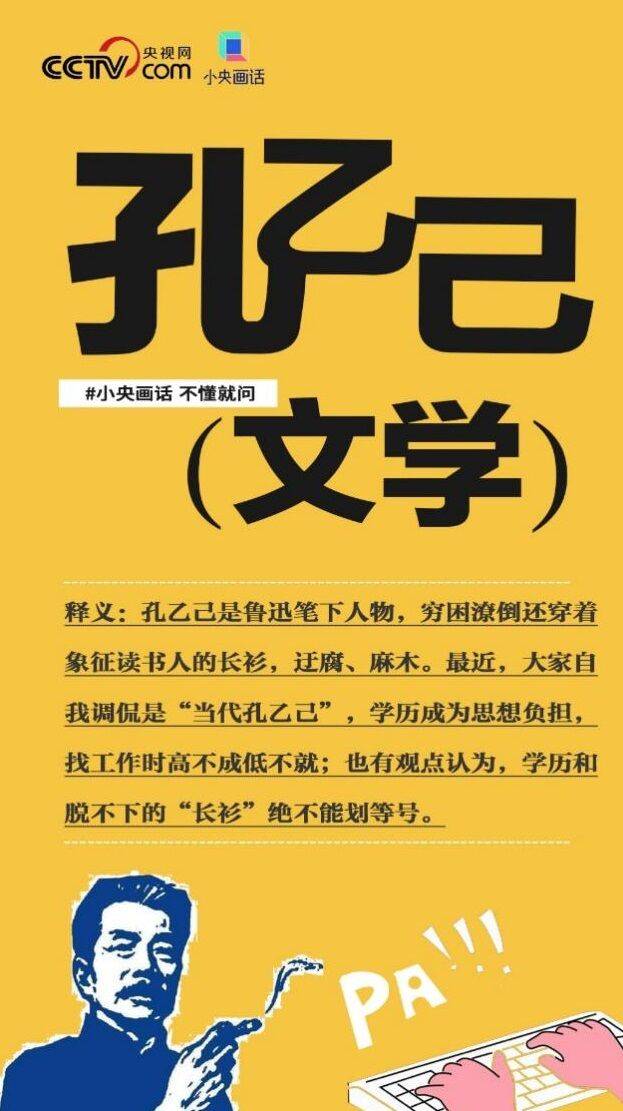 중국에서는 위와 같은 청년들의 문구에 '공을기 문학(孔乙己 文学)'이란 이름을 붙였습니다. 공을기(콩이지, kŏngyĭjĭ)는 아Q정전, 광인일기 같은 작품을 쓴 중국의 문학가 루쉰의 단편소설 제목입니다. 교과서에 실려 있기 때문에 중국 젊은이들이라면 누구나 아는 소설이자 소설 속 주인공의 이름이기도 합니다. 공을기는 유학에 기반한 관료 선발 제도인 과거제에 갇혀 있는 지식인으로 사서삼경 같은 고전 읽기와 쓰기 외에는 다른 능력이 없는 사람으로 묘사됩니다. 일반 백성과 선비를 구분 짓는 상징과도 같은 옷인 '긴 소매의 장삼' 입기를 고집하는 인물입니다. 공을기의 긴 가운과도 같은 옷은 육체노동으로 살아가는 사람들의 반팔 차림과 대비됩니다. 공을기는 가끔 대필을 해주고 받는 푼돈 외에는 수입이 없어 가난하지만, 자존심 놓지 못해 육체노동에는 종사하지 못합니다. 주점에서 자리를 잡고 탁자에 앉을 돈조차 없어서 '늘 서서 술을 마시는 사람'으로 표현됩니다.