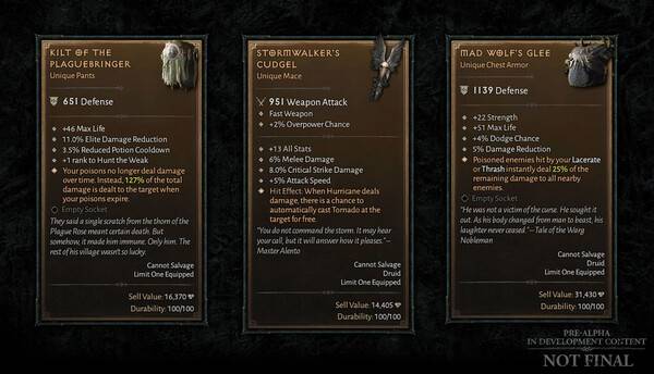 블리자드 설명에 따르면 전설 아이템은 일반 아이템보다 3배 이상의 성능을 자랑한다. 발매 직후 밸런스를 위해 세트 아이템은 제공되지 않는다. 고유 아이템은 일반 옵션 5개와 유니크 옵션 1개를 가지고 있다. 고유 아이템은 캐릭터 당 1개만 착용할 수 있다. 착용 개수가 제한되는 만큼 매우 강력한 성능을 자랑한다.