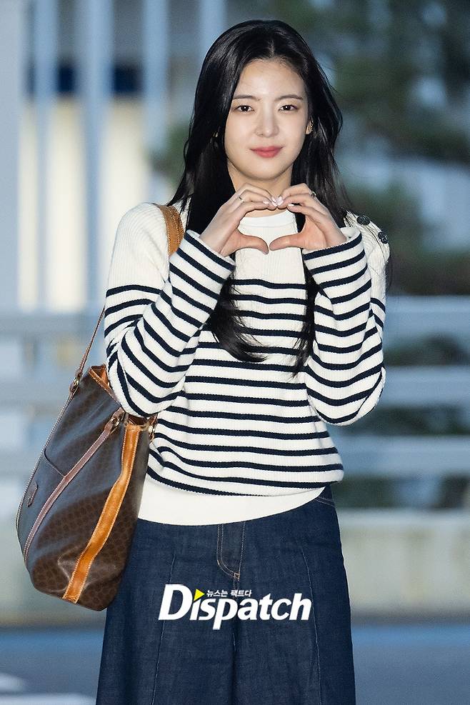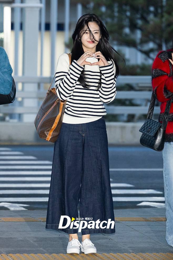 리아는 줄무늬 니트에 청바지로 러블리한 분위기를 연출했다.