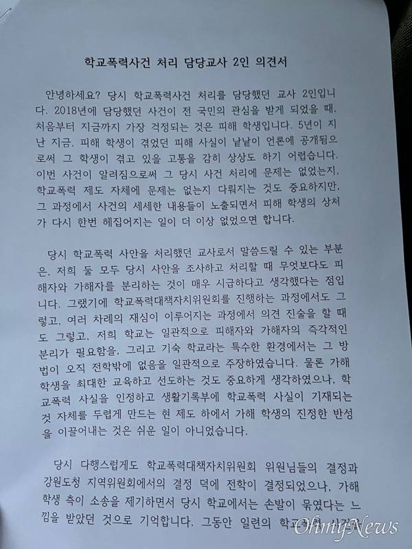 이 의견서에서 두 교사는 "당시 학폭 처리 교사로서 저희 둘 모두 피해자와 가해자를 분리하는 것이 매우 시급하다고 생각했다"면서 "그랬기에 학교 학폭대책자치위와 재심이 이뤄지는 과정에서 저희 학교는 일관적으로 즉각적인 분리가 필요함을 주장했다"라고 밝혔다.