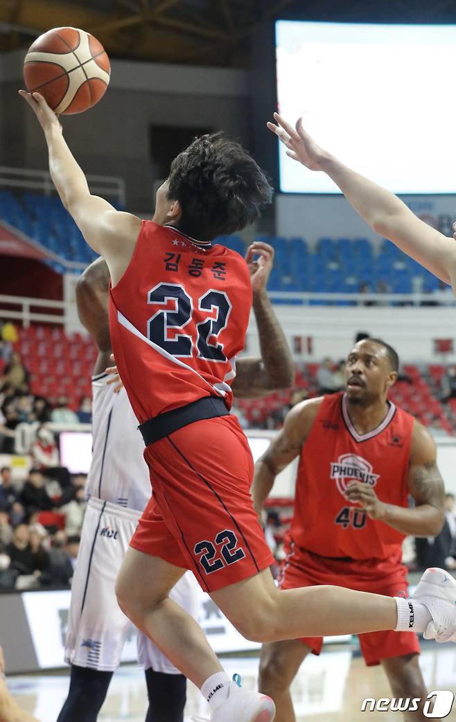 (울산=뉴스1) 김지혜 기자 = 17일 오후 울산 동천체육관에서 열린 'SKT 에이닷 프로농구 2022-2023 KBL' 울산 현대모비스와 전주 KCC의 경기에서 현대모비스 김동준이 슛을 하고 있다. 2023.3.17/뉴스1