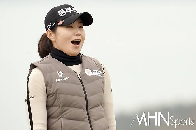 (MHN스포츠 여수, 박태성 기자) 17일 전남 여수시에 위치한 디오션컨트리클럽 이스트-웨스트 코스(파72ㅣ6,110야드)에서 KLPGA투어 최고 골프구단을 가리는 '디오션 비치콘도 발리스틱 컵 골프구단 대항전' 1라운드가 열린가운데, 동부건설 장수연이 18번홀 긴 거리 버디를 성공시키며 자신도 놀라고 있다.