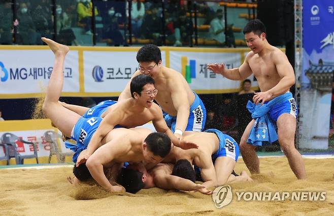 (서울=연합뉴스) 17일 경상북도 문경실내체육관에서 열린 제53회 회장기전국장사씨름대회 고등학교부 단체전에서 우승한 송곡고등학교 선수들이 세리머니를 하고 있다. 2023.3.17 [대한씨름협회 제공. 재판매 및 DB 금지]