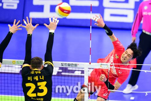 [마이데일리 = 수원 곽경훈 기자] 한국전력 강우석이 17일 오후 경기도 수원실내체육관에서 진행된 '도드람 2022-2023 V-리그' 한국전력-KB손해보험의 경기에서 공격을 시도하고 있다.- ⓒ마이데일리(www.mydaily.co.kr). 무단전재&재배포 금지 -