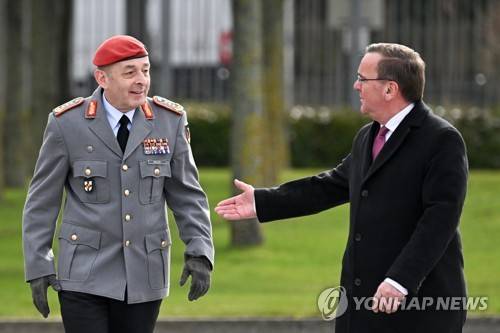 epa10528441 New Inspector General of the German Army (Bundeswehr) Carsten Breuer (L) talks with German Defense Minister Boris Pistorius during his appointment ceremony at the Defense Ministry in Berlin, Germany, 17 March 2023. EPA/Filip Singer
