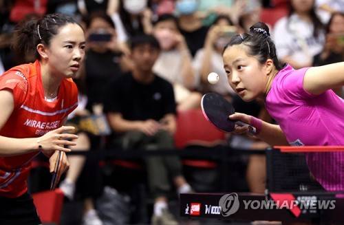 epa10528520 Shin Yubin (R) and Jeon Jihee of South Korea in action against Wang Manyu and Sun Yingsha of China during their Women's doubles semi-final match at the Singapore Smash 2023 Table Tennis Tournament in Singapore, 17 March 2023. EPA/HOW HWEE YOUNG