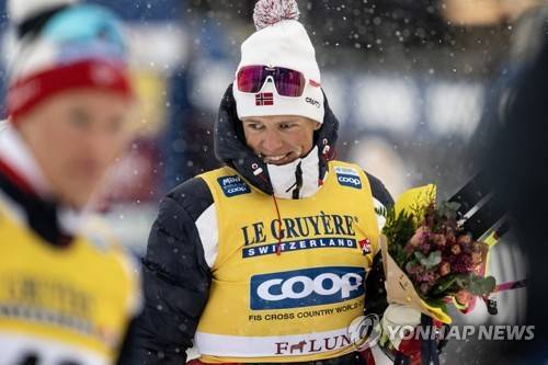 epa10528513 Johannes Hoesflot Klaebo of Norway smiles after winning the Men's 10km Classic race of the FIS Cross Country Skiing World Cup in Falun, Sweden, 17 March 2023. EPA/Ulf Palm SWEDEN OUT
