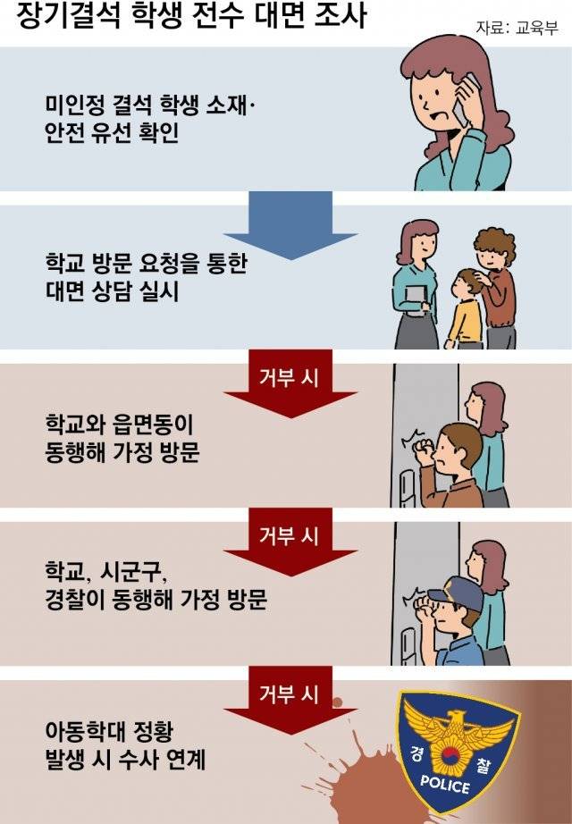 교육부는 장기 미인정 결석 학생은 전화로 소재와 안전이 확인됐더라도 이번처럼 대면 관찰을 실시하도록 ‘아동학대 예방 및 대처요령 교육부문 가이드북’을 개정했다. 미인정 결석 7일을 포함해 결석이 14일 이상 누적된 학생은 ‘집중 관리 대상자’로 모니터링한다.