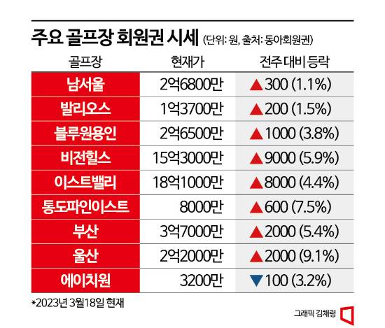골프회원권, 봄 시즌 보합세 계속…비전힐스↑·에이치원↓