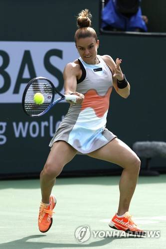 epa10529331 Maria Sakkari of Greece in action against Aryna Sabalenka of Belarus in the women's semifinal round of the BNP Paribas Open tennis tournament at the Indian Wells Tennis Garden in Indian Wells, California, USA, 17 March 2023. EPA/JOHN G. MABANGLO