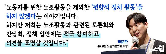 '탈정치'를 내세우면 가장 반길 만한 건 정부다. 이번 정부는 노동 개혁을 앞세워 회계 공개를 추진하고 있는데, 주된 타깃은 기존의 양대 노총이다. 정부는 반면에 새로고침은 'MZ세대'로 부르면서 지원을 해주겠다고 활동을 독려하고 있다. 정부 입장에서 부담이 되는 '정치적 목소리'를 내는 양대 노총은 배제하고 '탈정치적 면모'를 보이는 새로고침과 소통하겠다는 자세가 보인다. 하지만 출범 전과 달리 새로고침은 정치적 목소리를 내기 시작했다.