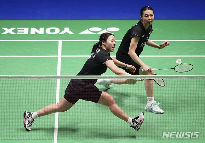 [버밍엄=AP/뉴시스] 김소영(뒤)-공희영이 17일(현지시간) 영국 버밍엄에서 열린 세계배드민턴연맹(BWF) 요넥스 전영오픈 여자복식 8강전에서 천칭천-자이판(중국)과 경기하고 있다. 김소영-공희영(6위) 조는 세계 최강 천칭천-자이판(1위) 조에 2-1(19-21 22-20 24-22) 역전승을 거두고 준결승에 올랐다. 2023.03.18.