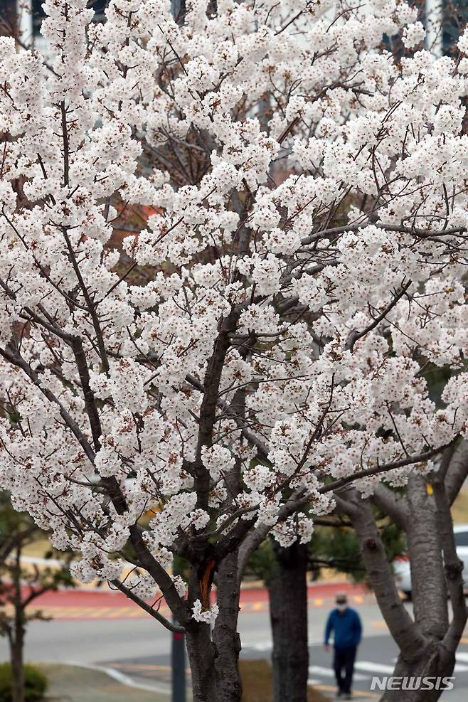 [부산=뉴시스] 하경민 기자 = 포근한 봄 날씨를 보인 18일 오전 부산 남구의 한 도로변에 벚꽃이 활짝 펴 눈길을 사로잡고 있다. 2023.03.18. yulnetphoto@newsis.com