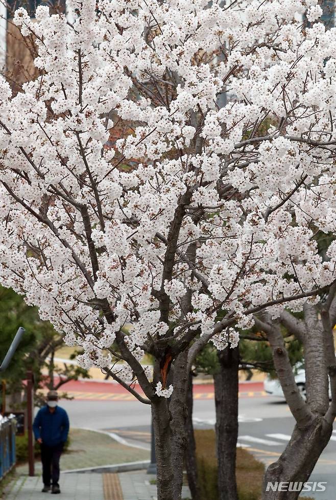 [부산=뉴시스] 하경민 기자 = 포근한 봄 날씨를 보인 18일 오전 부산 남구의 한 도로변에 벚꽃이 활짝 펴 눈길을 사로잡고 있다. 2023.03.18. yulnetphoto@newsis.com