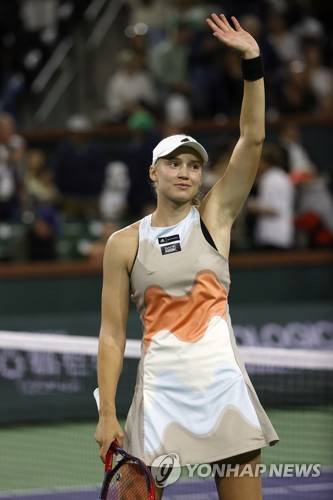 epa10529413 Elena Rybakina of Kazakhstan acknowledges the crowd after winning match point to defeat Iga Swiatek of Poland during the women's semifinal round of the BNP Paribas Open tennis tournament at the Indian Wells Tennis Garden in Indian Wells, California, USA, 17 March 2023. EPA/JOHN G. MABANGLO