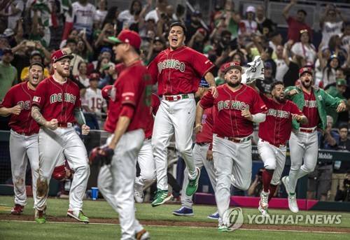 epa10529430 Players of Mexico celebrate after winning the 2023 World Baseball Classic quarter finals match between Mexico and Puerto Rico at loanDepot park baseball stadium in Miami, Florida, USA, 17 March 2023. EPA/CRISTOBAL HERRERA-ULASHKEVICH