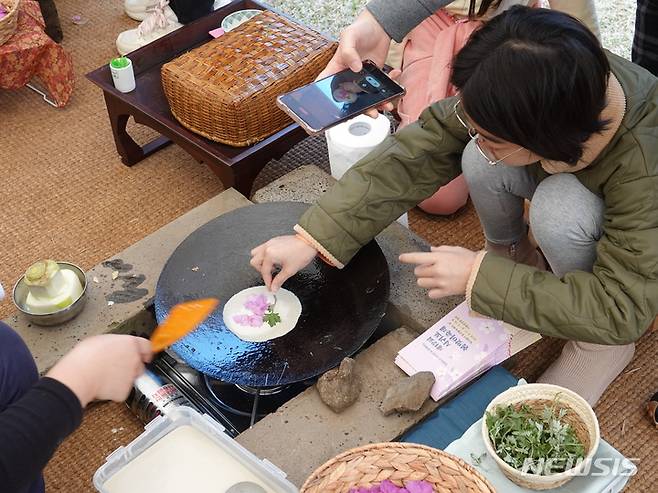 [제주=뉴시스] 오영재 기자 = 18일 오전 서귀포시 서귀동 이중섭공원 일대에서 열린 제12회 서귀포 봄맞이 축제에서 어린이가 진달래꽃 화전을 만들고 있다. 2023.03.18. oyj4343@newsis.com