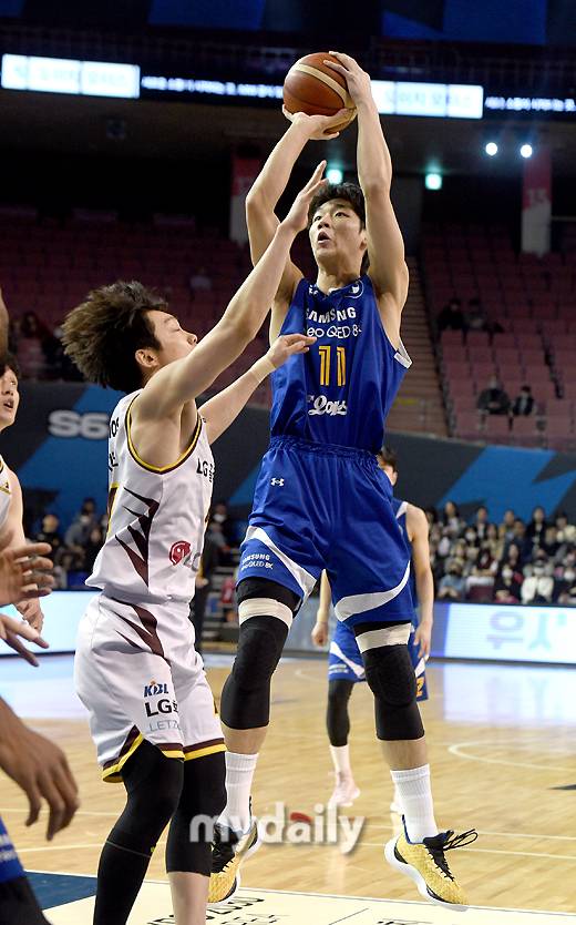 [마이데일리 = 유진형 기자] 서울삼성 이원석이 18일 오후 서울 잠실실내체육관에서 진행된 '2022-2023 SKT 에이닷 프로농구' 서울삼성과 창원LG의 경기에서 점프슛을 하고 있다.