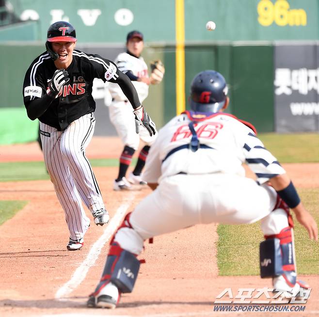 2023 KBO리그 시범경기 롯데 자이언츠와 LG 트윈스의 경기가 18일 부산 사직구장에서 열렸다. 7회초 1사 2,3루 LG 정주현의 내야 땅볼 때 3루 주자 홍창기가 홈을 파고들고 있다. 부산=박재만 기자 pjm@sportschosun.com/2023.03.18/