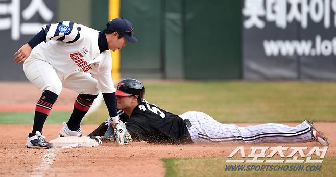 2023 KBO리그 시범경기 롯데 자이언츠와 LG 트윈스의 경기가 18일 부산 사직구장에서 열렸다. 7회초 1사 2,3루 LG 홍창기가 3루를 훔치고 있다. 부산=박재만 기자 pjm@sportschosun.com/2023.03.18/
