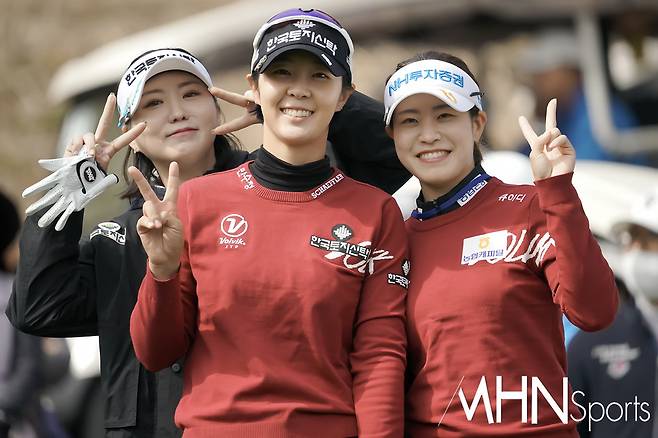(MHN스포츠 여수, 박태성 기자) 18일 전남 여수시에 위치한 디오션컨트리클럽 이스트-웨스트 코스(파72ㅣ6,110야드)에서 KLPGA투어 최고 골프구단을 가리는 '디오션 비치콘도 발리스틱 컵 골프구단 대항전'(총상금 6천만원ㅣ우승상금 3천만원) 변형포섬 2라운드가 열린가운데, 한국토지신탁 조아연, 박지영, NH투자증권 박민지가 포즈를 취하고 있다.