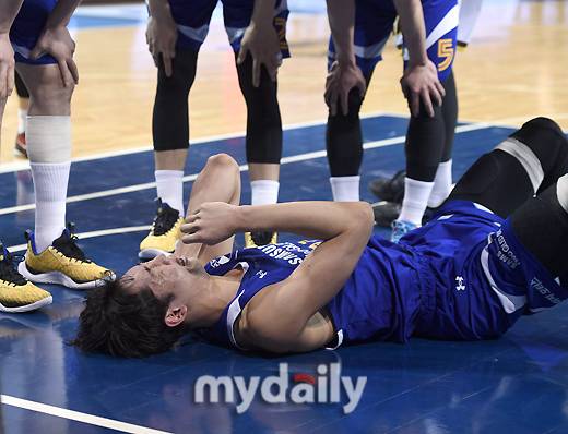 [마이데일리 = 유진형 기자] 서울삼성 이원석이 18일 오후 서울 잠실실내체육관에서 진행된 '2022-2023 SKT 에이닷 프로농구' 서울삼성과 창원LG의 경기에서 고통스러워하고 있다.